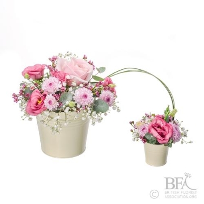 Two arrangements joined  by a loop of bear grass to represent the umbilical cord. A perfect gift for a mother and a baby girl.