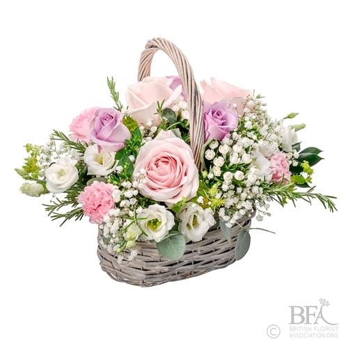 This pretty basket arrangement of delicate soft shades of pink flowers is suitable for many occasions, from the birth of a baby girl, to grandmothers birthday.